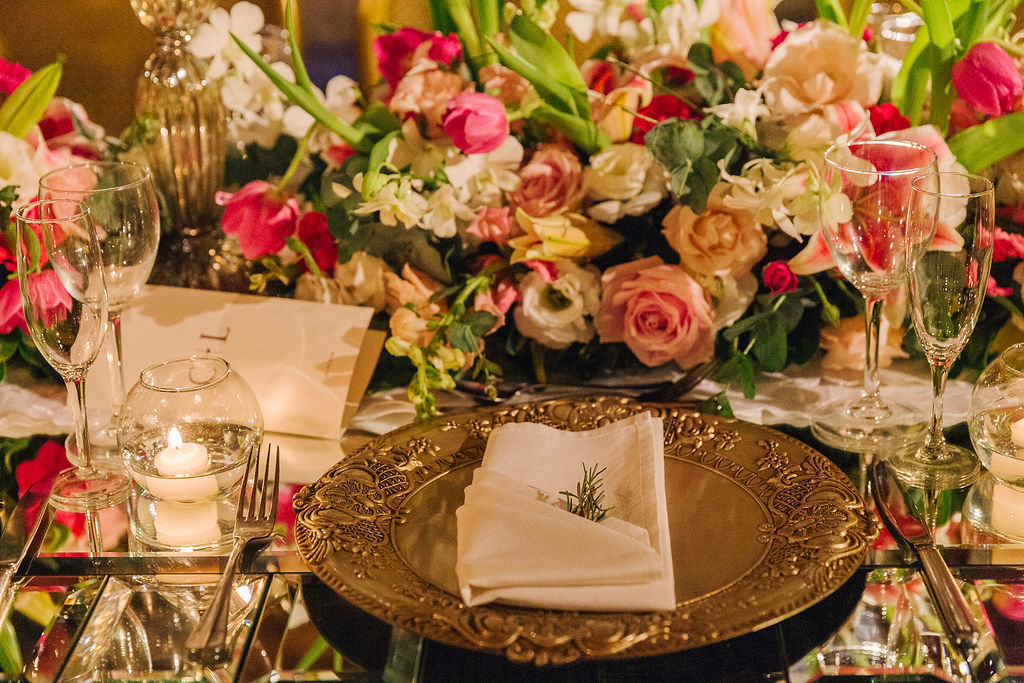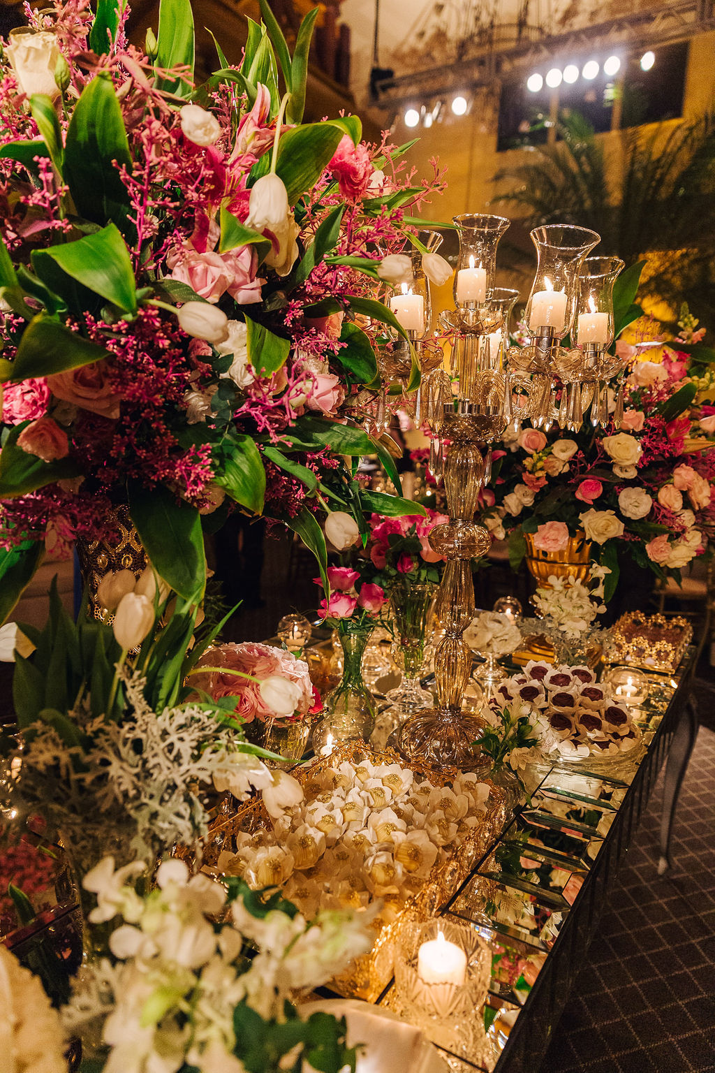 Para o mobiliário escolhemos a linha espelhada e fizemos uma mescla de peças do nosso acervo com material dos nossos fornecedores. Para as flores, milhares de botões nos tons de rosa e branco deixaram o ambiente ainda mais aconchegante e requintado.