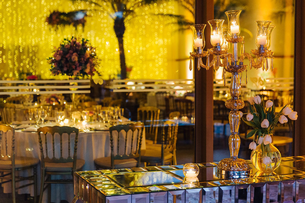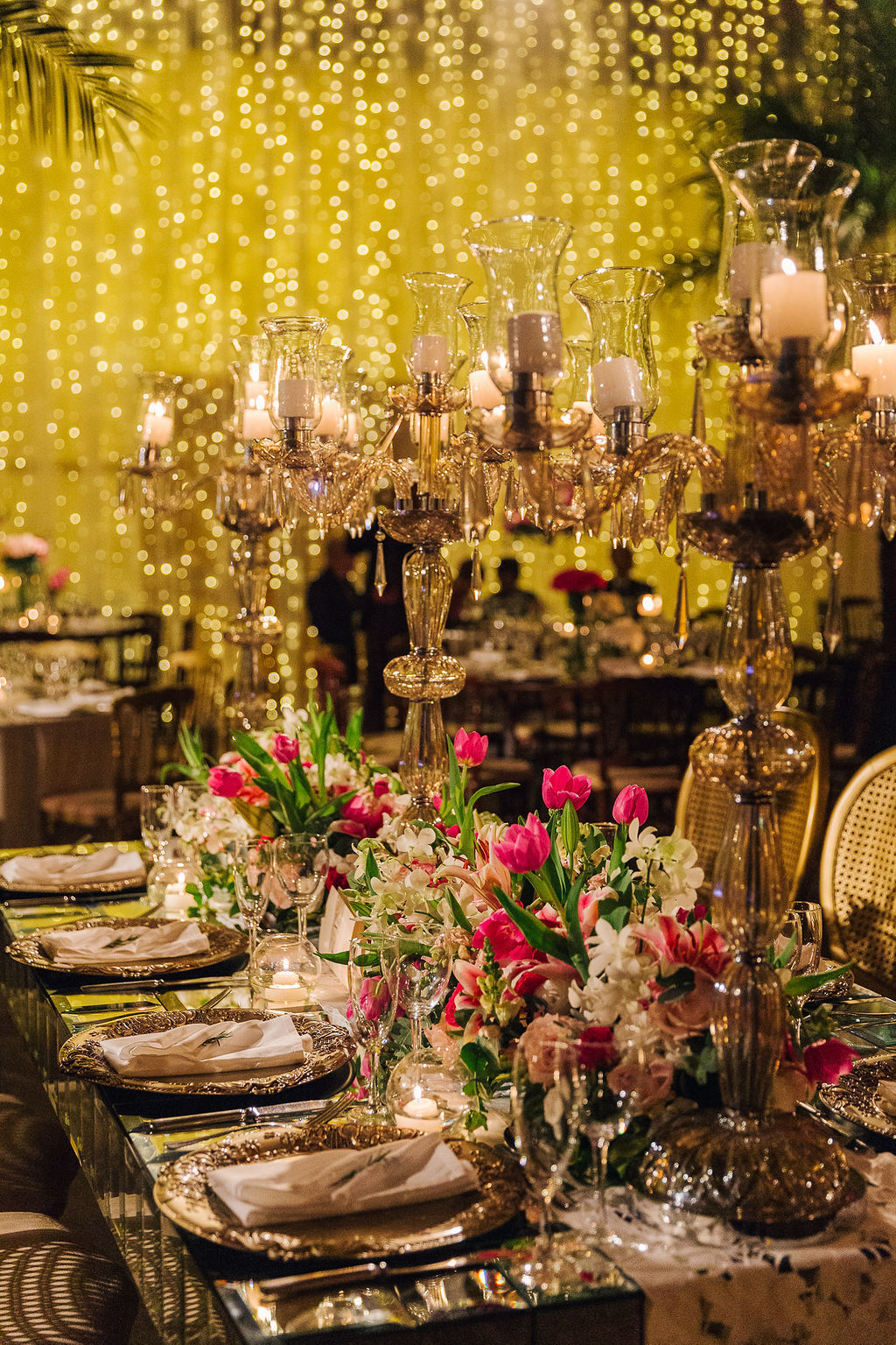 Também utilizamos muitas velas, lustres de cristais, árvores francesas, paisagismo verde e luzes para criar um cenário de sonhos.
