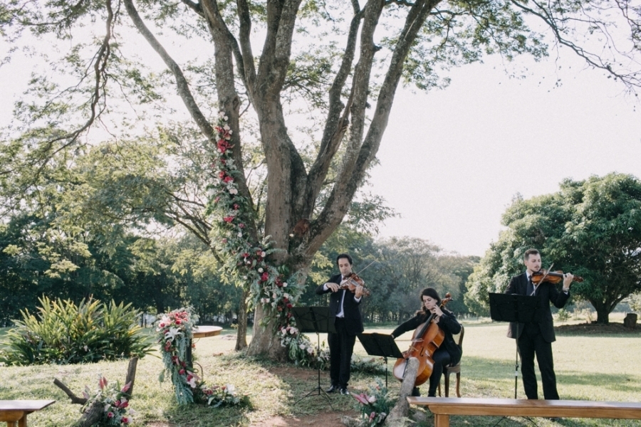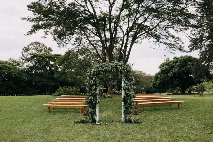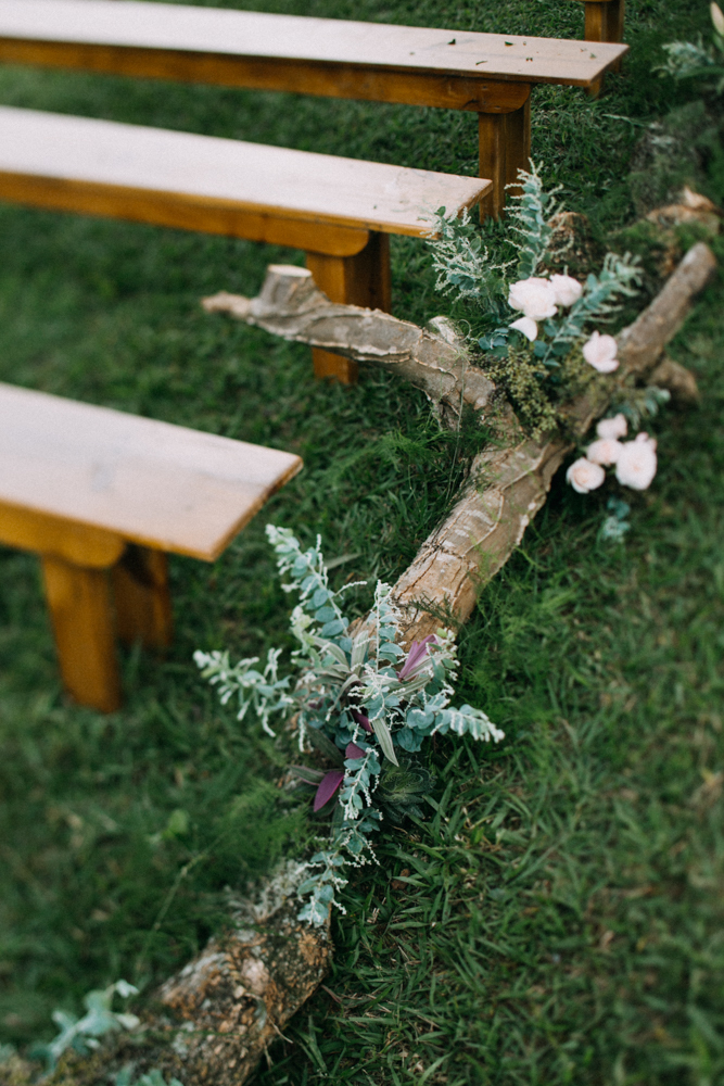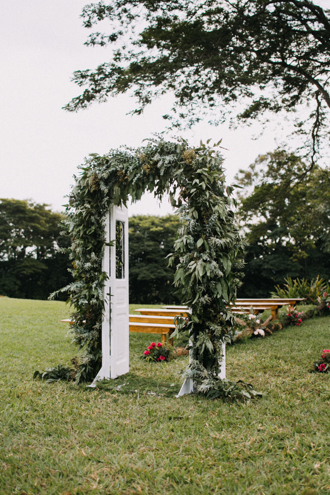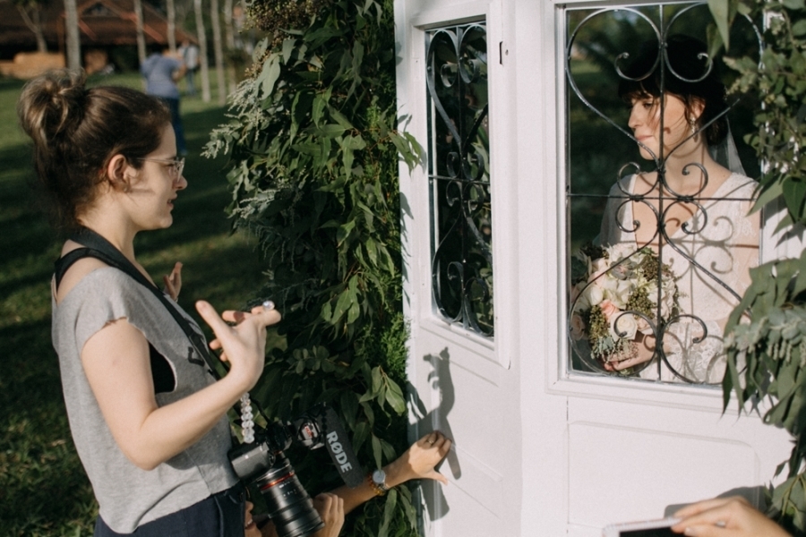 A primeira preocupação era a porta de entrada da cerimônia… ponto alto do filme! A ideia era construir um portal cheio de significados, porém algo leve que estivesse misturado com a natureza. Pensamos, então, em um arco de folhagens ao redor da porta para que conseguíssemos passar a ideia de que a noiva estava realmente em meio a natureza, mas sem perder o significado do “abrir de portas” no dia do “sim”.