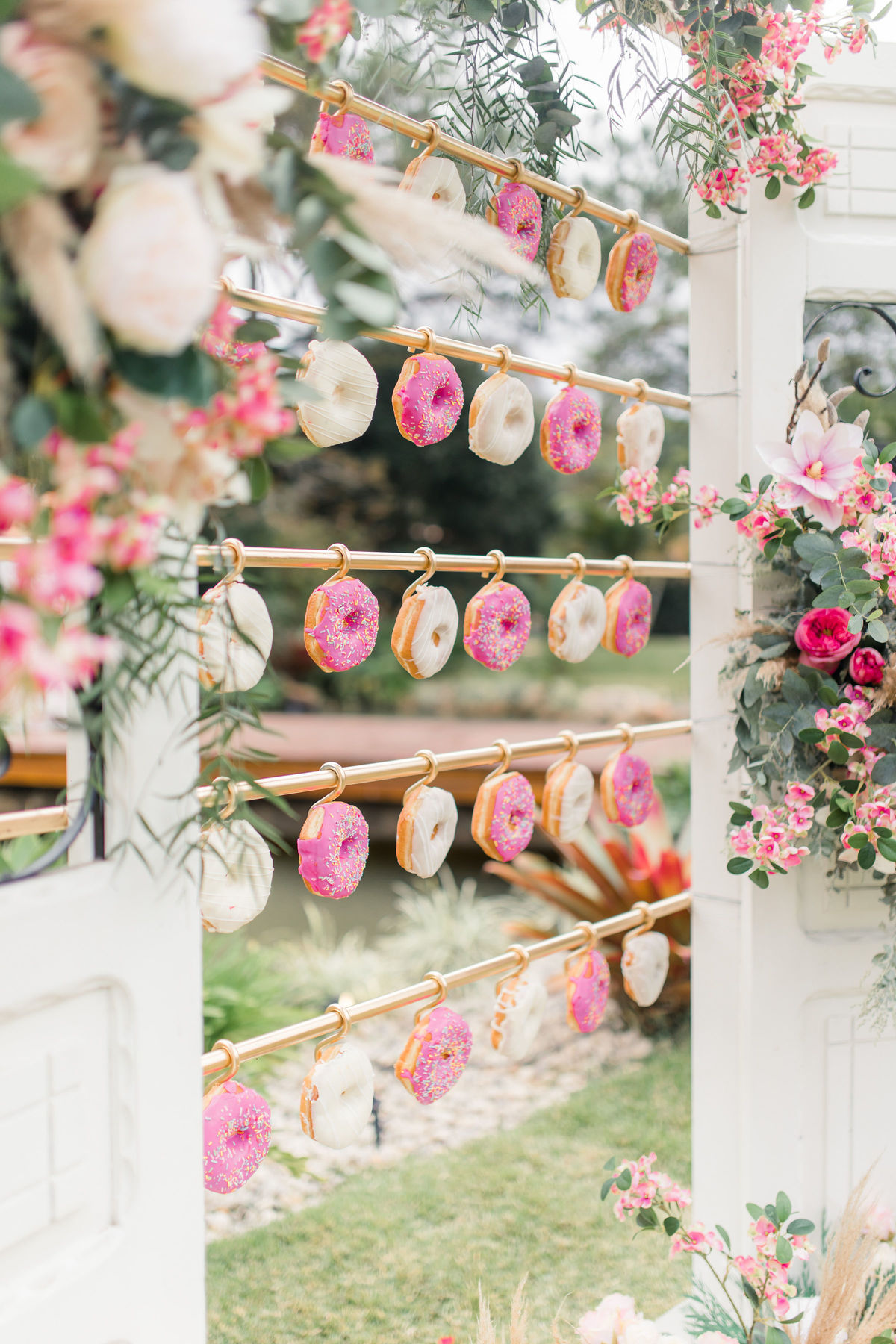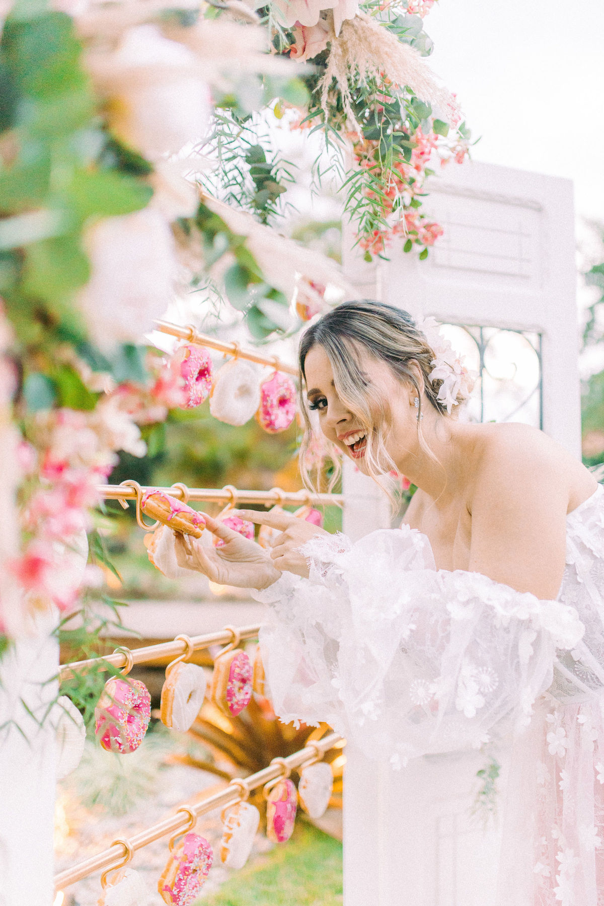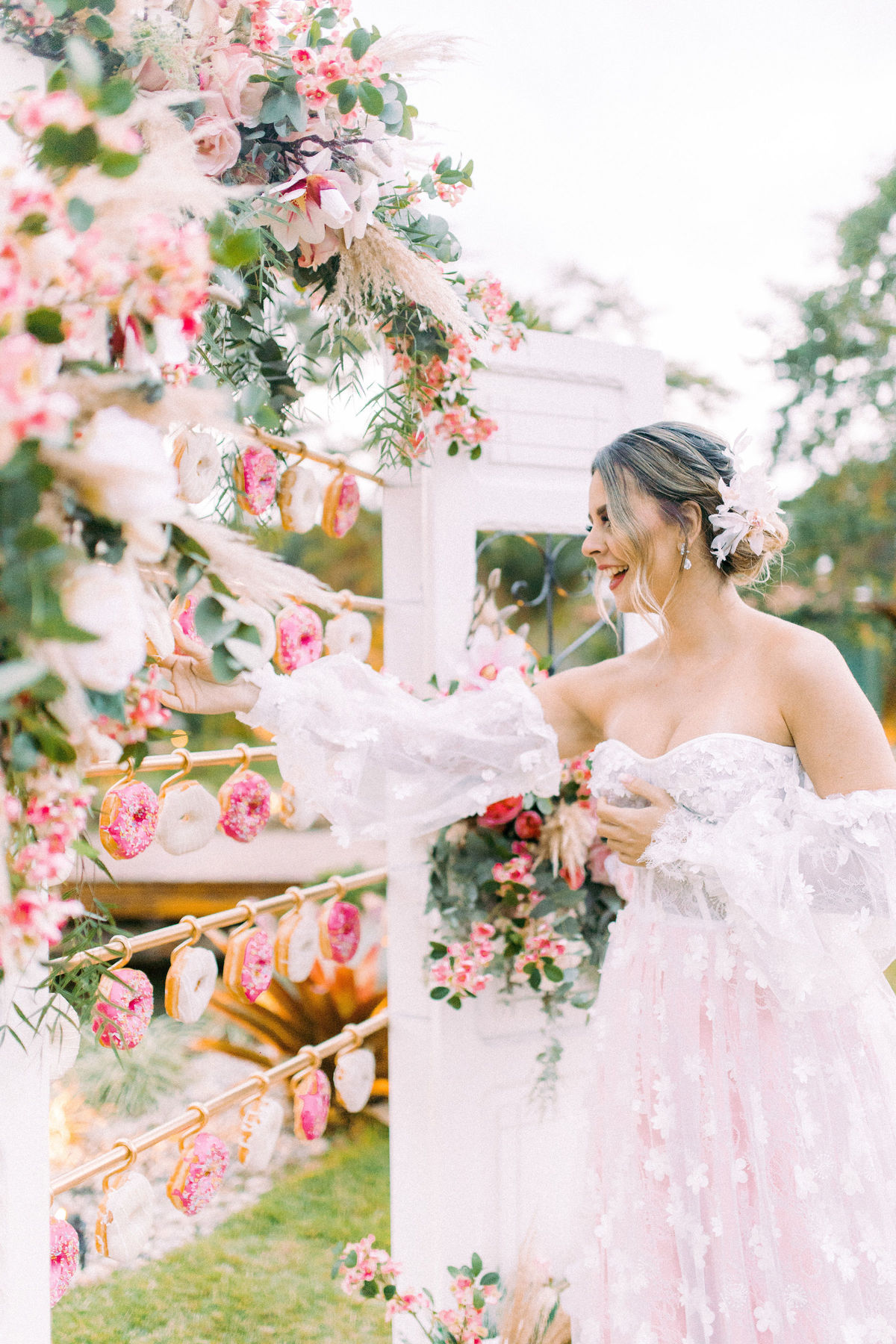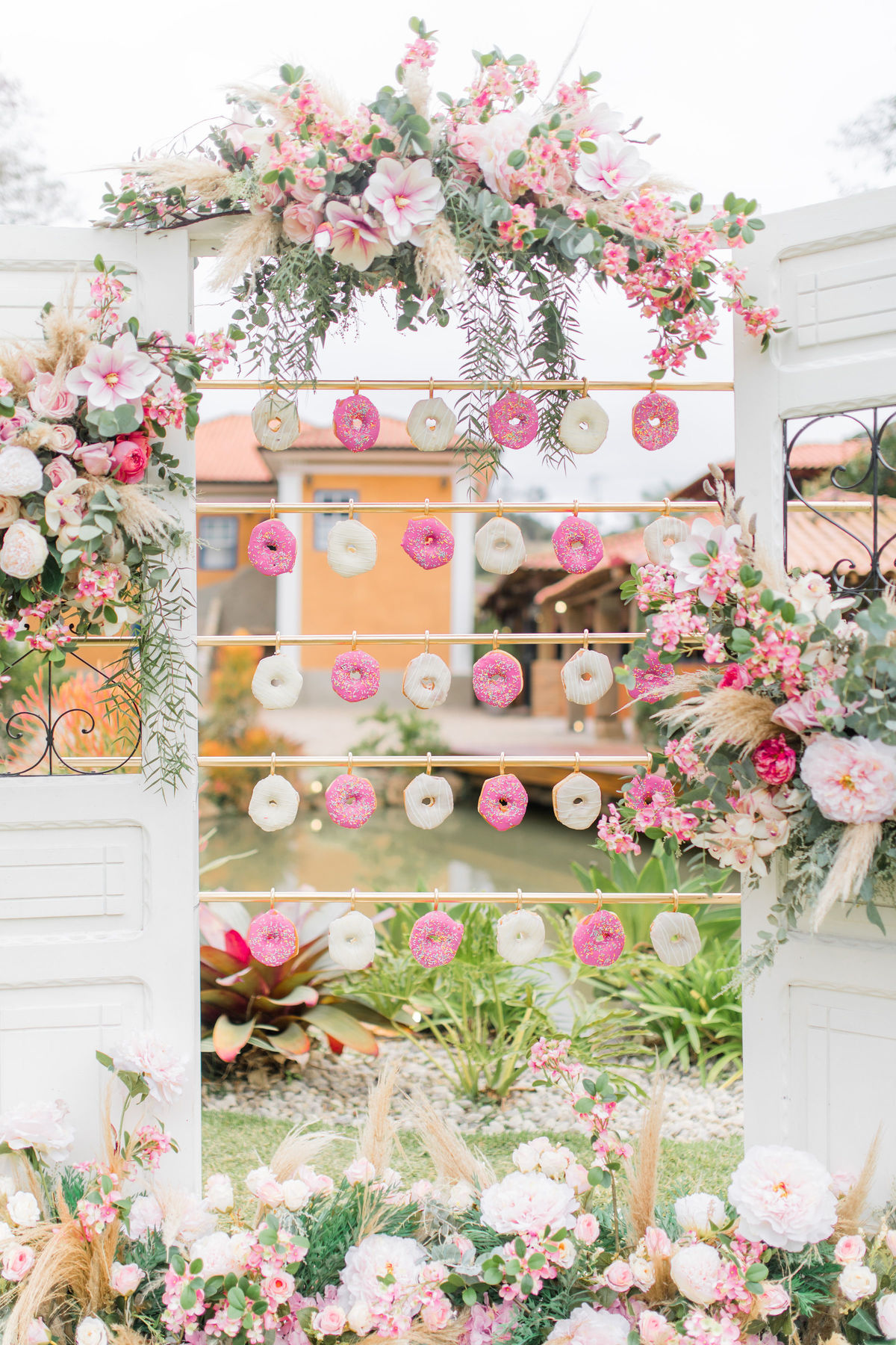 Para quem não sabe essa porta é normalmente usada para a entrada da noiva na cerimônia, mas nesse editorial incrível decidimos usar como um cantinho instagramável com donuts, isso mesmo, DONUTS!