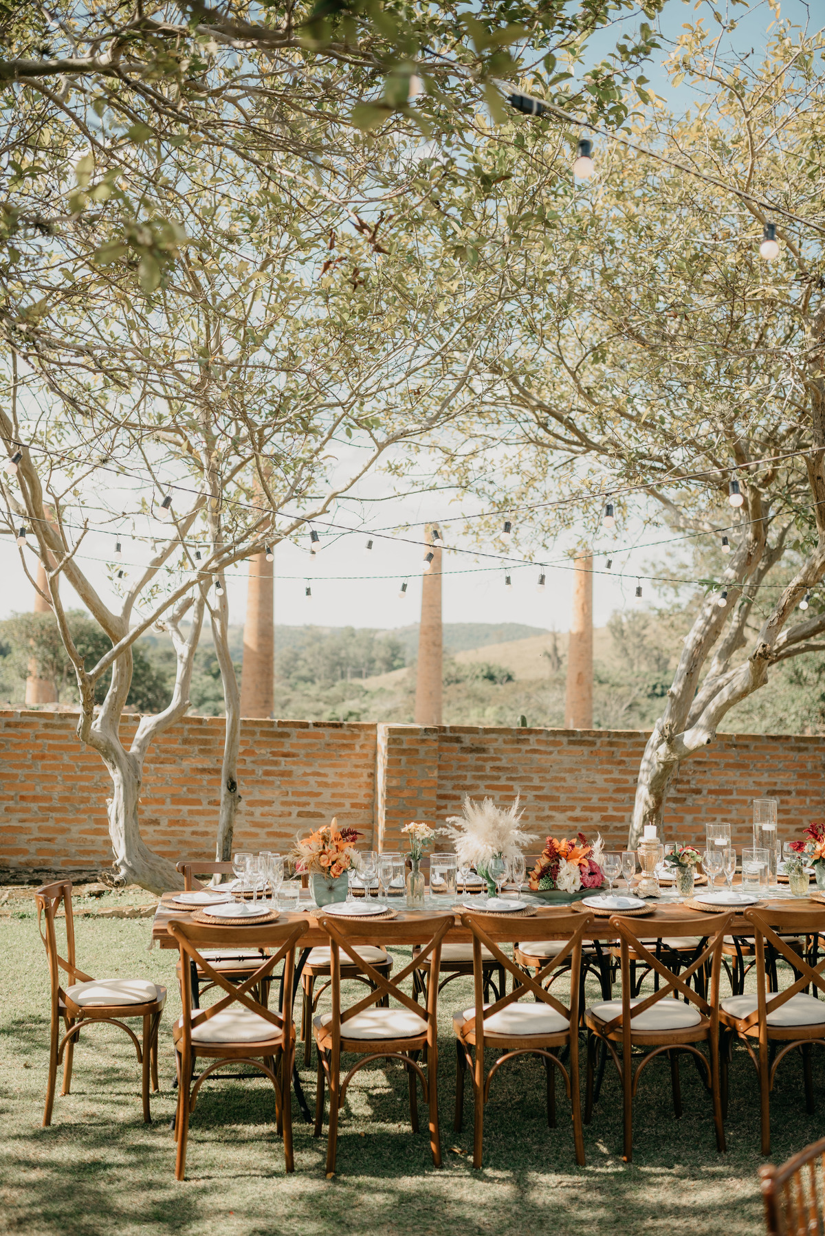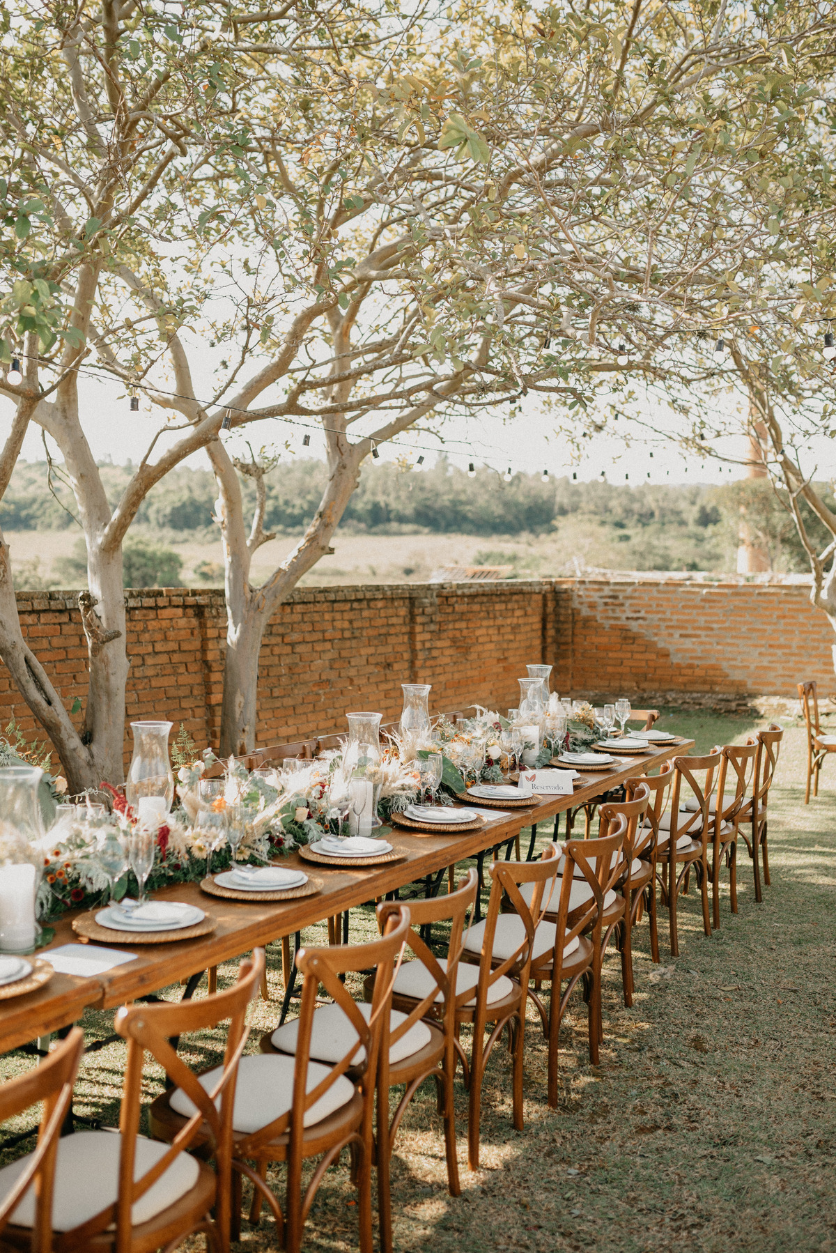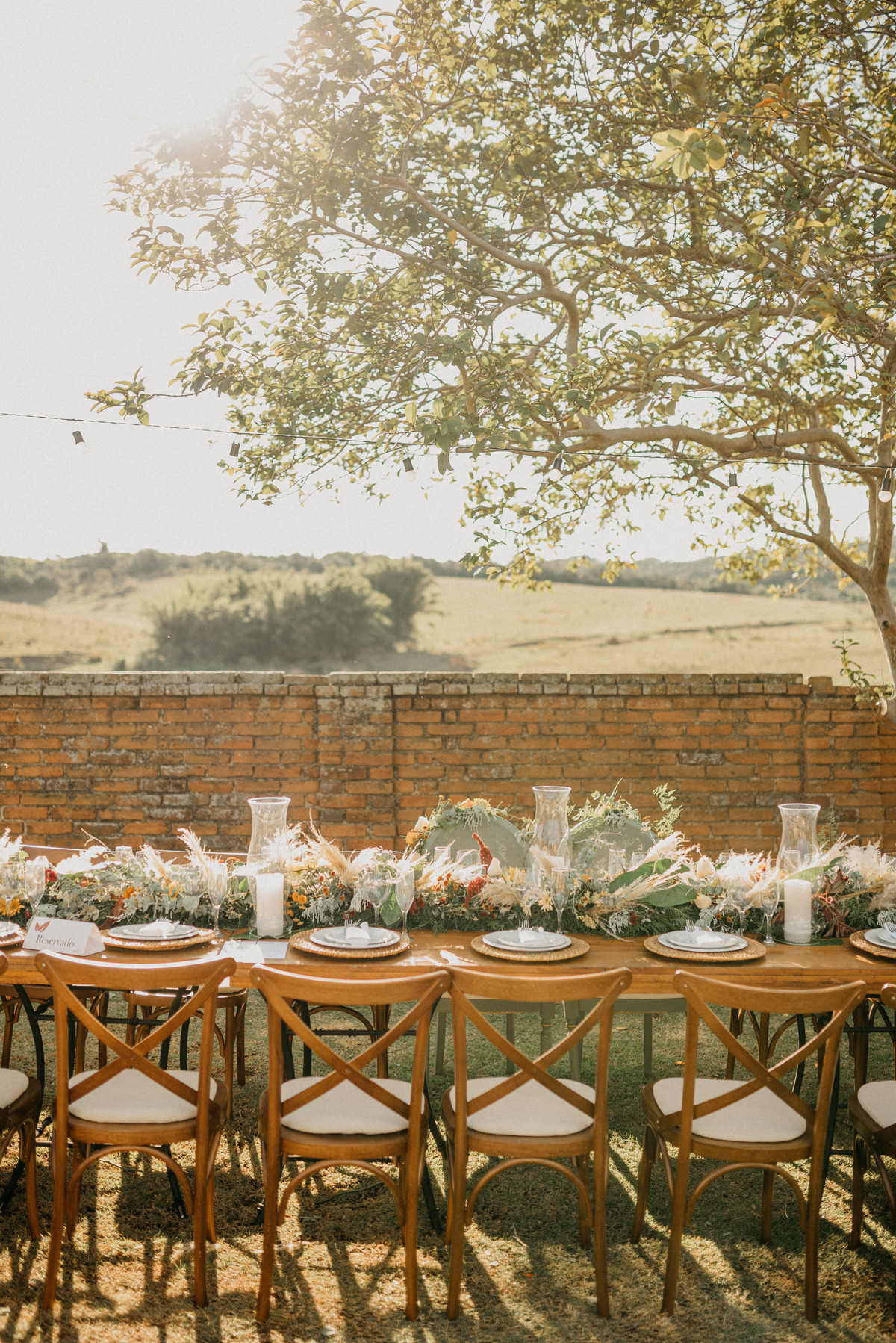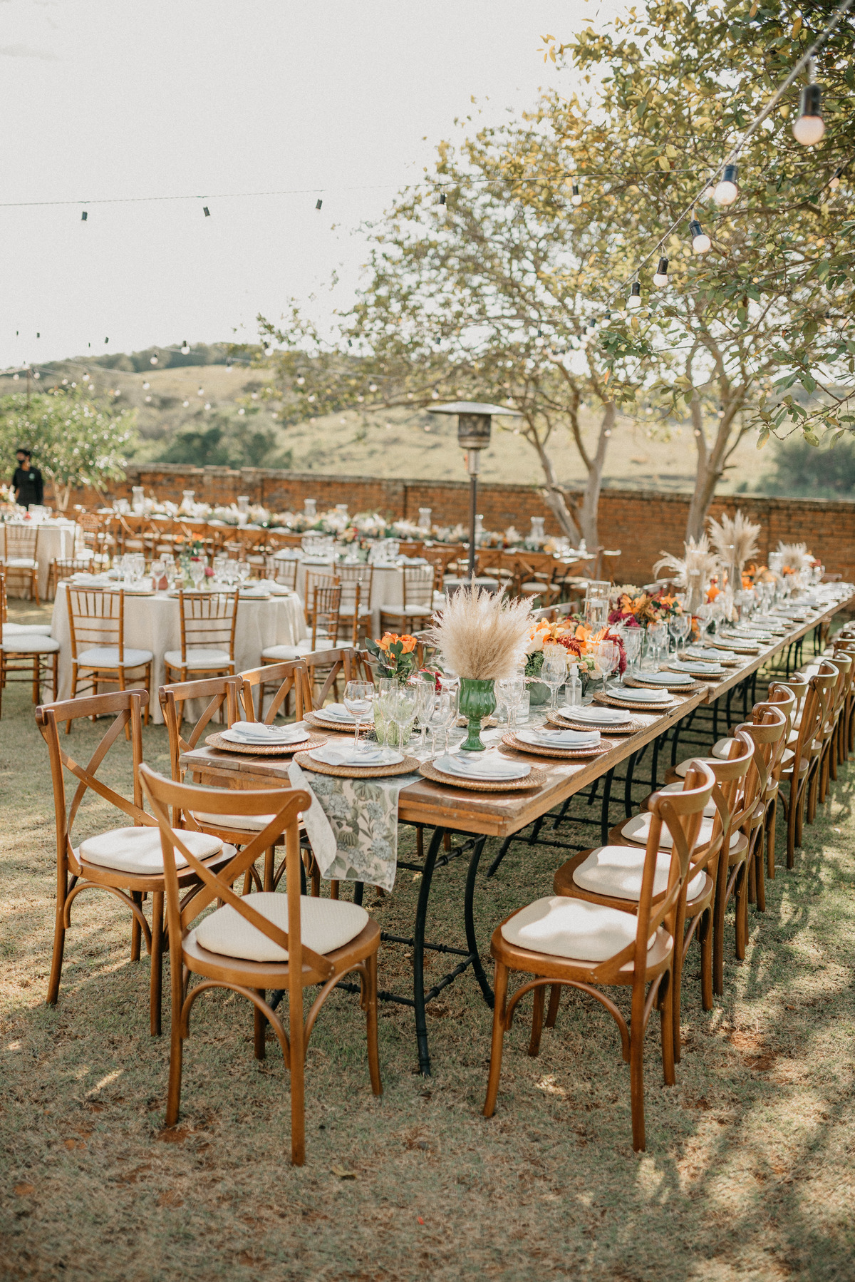 Tons terrosos, por sol e mesas comunitárias deram o toque mais que especial para essa decoração perfeita.