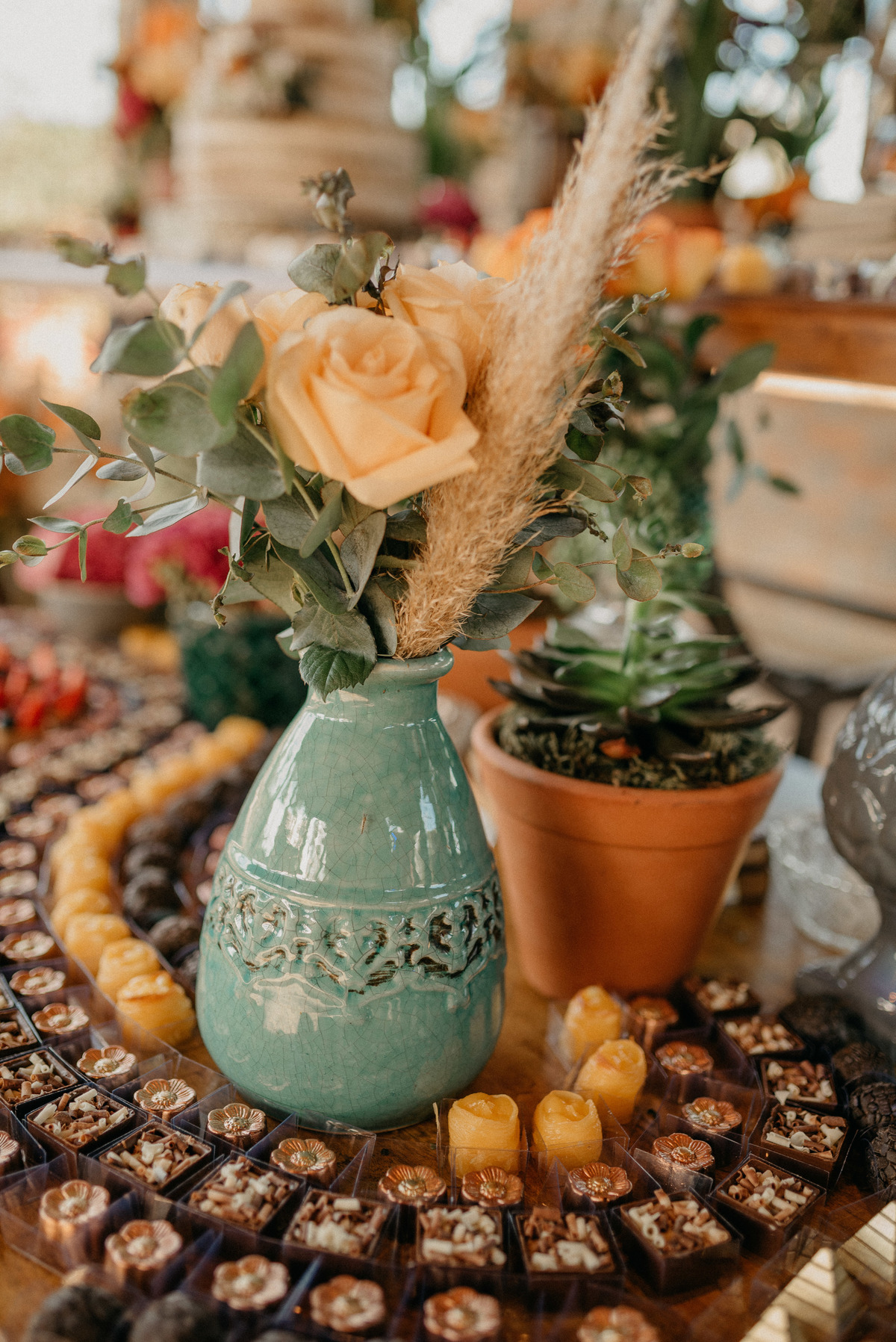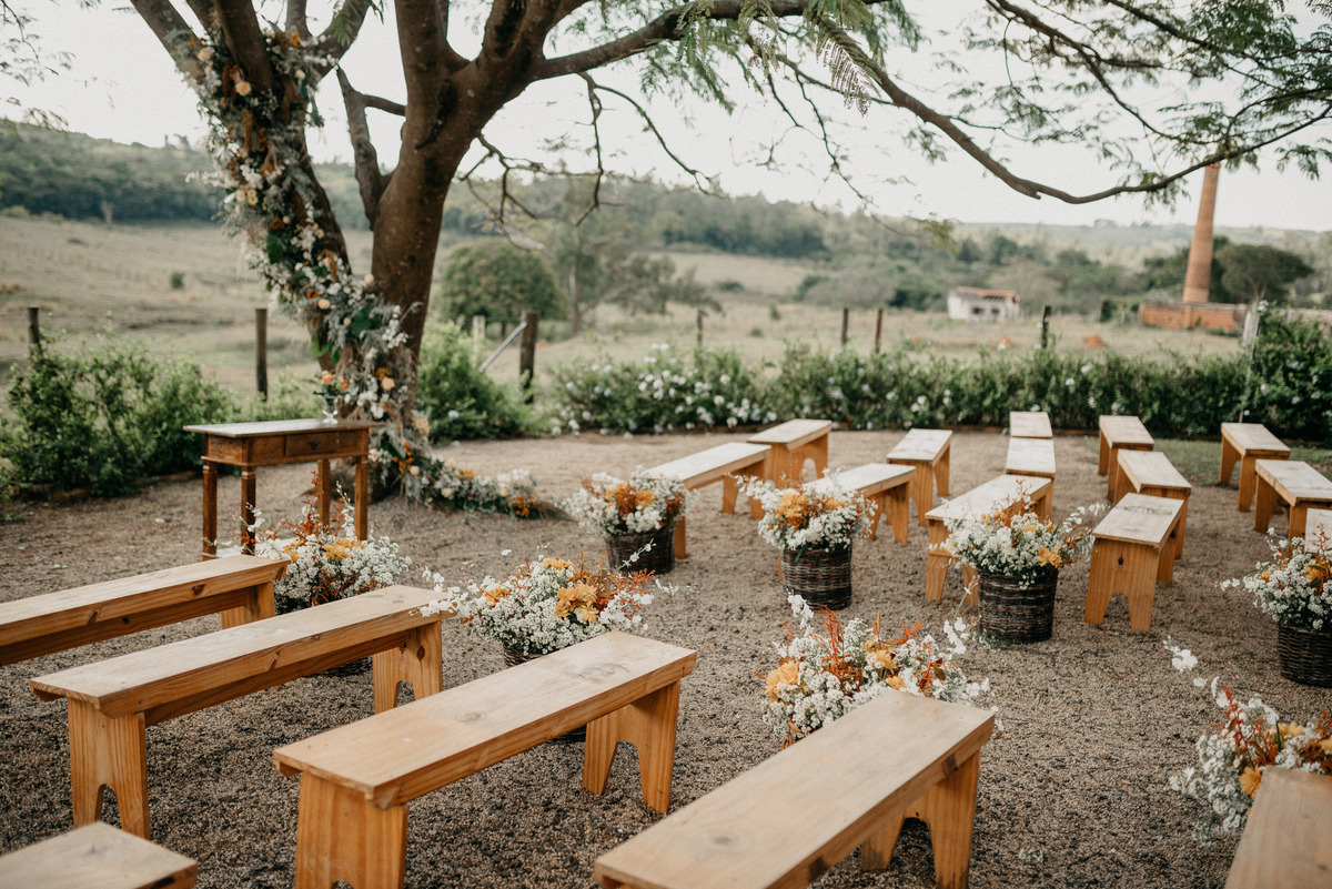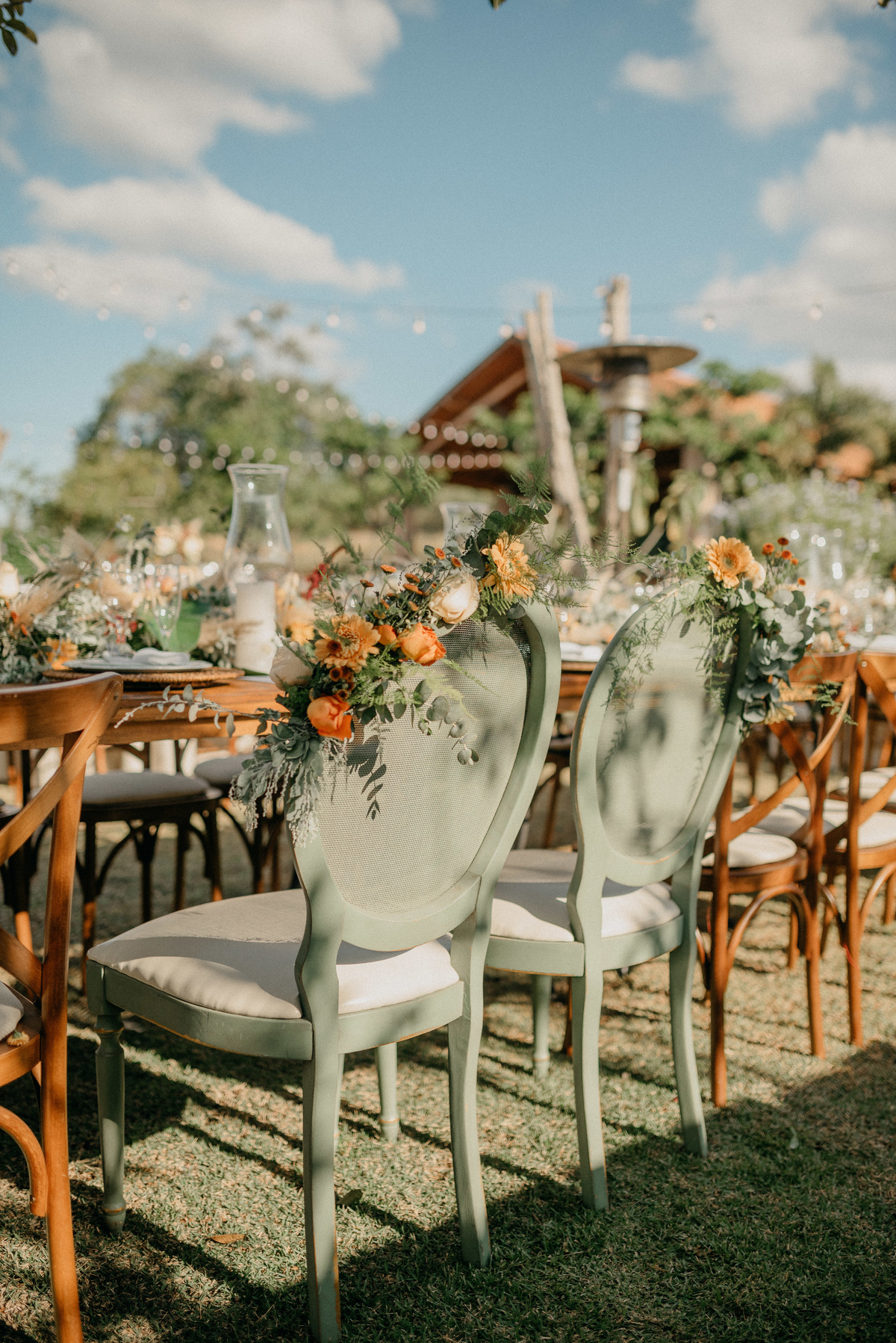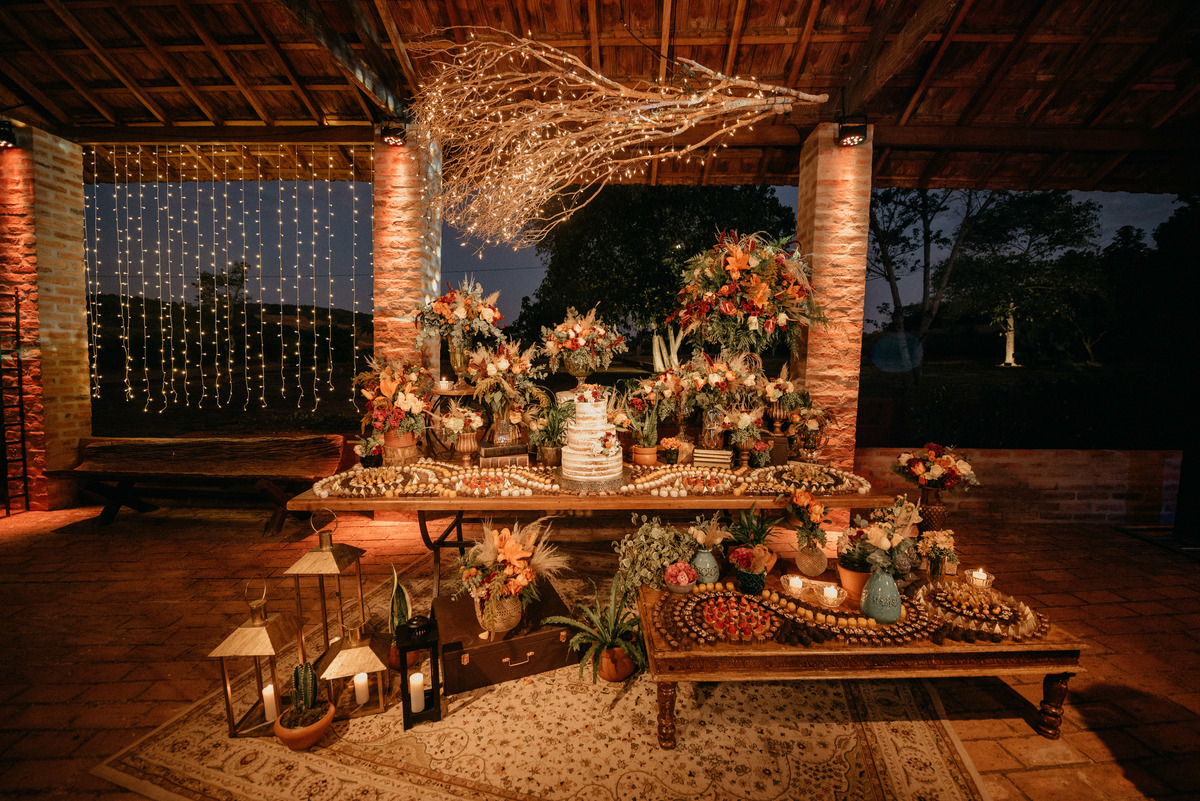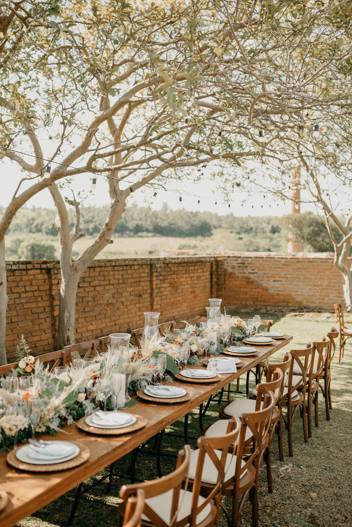 Tons terrosos, por sol e mesas comunitárias deram o toque mais que especial para essa decoração perfeita.