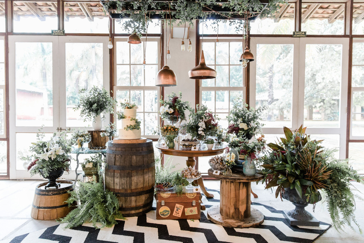 O centro de destaque de qualquer recepção de casamento com certeza é a mesa de bolo, e aqui não seria diferente. Para compor esse ambiente no estilo rústico é possível combinar mesas em madeira aparente com malas, caixotes, paletes e carretéis de madeira. Na parte floral o uso de flores e folhas secas pode dar um toque especial na composição.