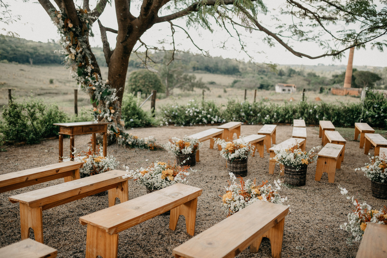 Pergolados, troncos, barris, caixotes, as possibilidades são infinitas na hora de planejar a decoração da cerimônia. É comum usar peças como bancos de madeira, arcos floridos, tomadas e portas antigas. Para trazer um ar mais romântico é interessante apostar no caminho de pétalas. Outra aposta muito usada para modernizar o estilo rústico são as estruturas geométricas, que deixam o altar super original e descontraído.