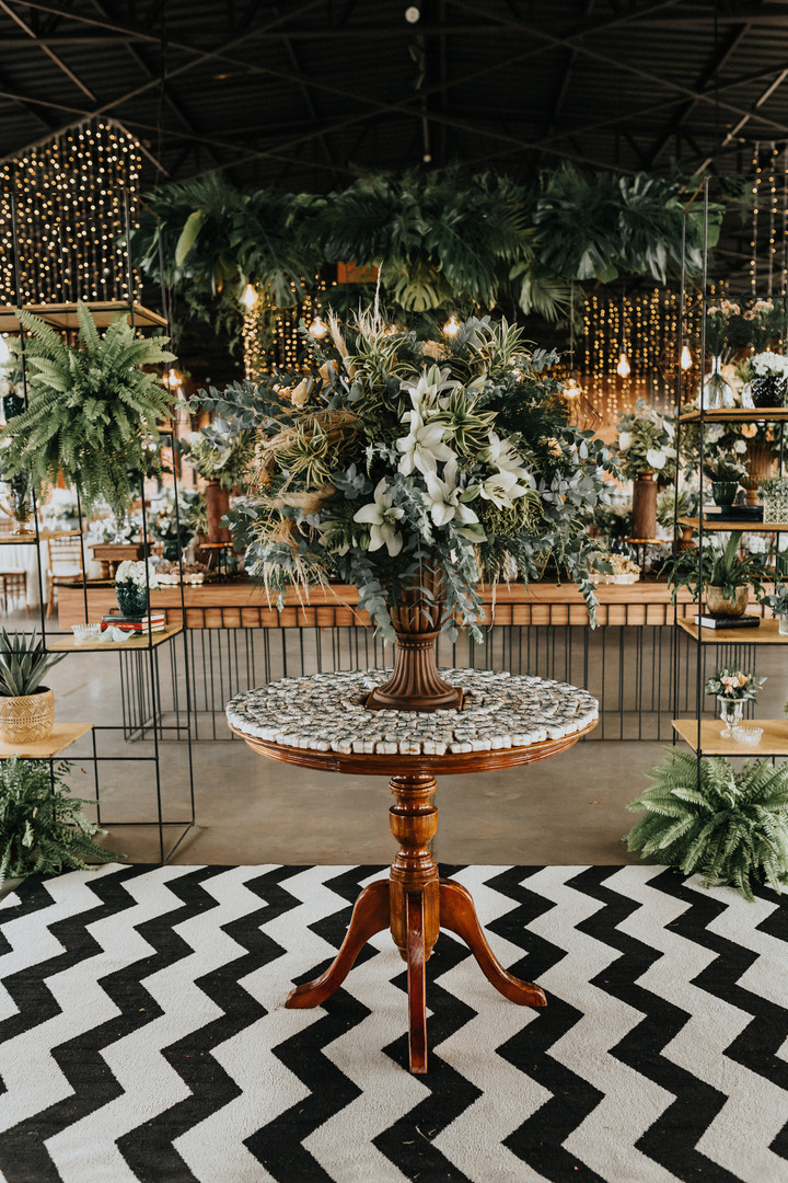 Noivos modernos e ousados amam o estilo de decoração de casamento industrial. E ele é muito fácil de identificar: presença de ferro, paleta de cores sóbria e objetiva no cinza e preto. Alguns gostam de mesclar com peças rosa gold, dourado e vidro.