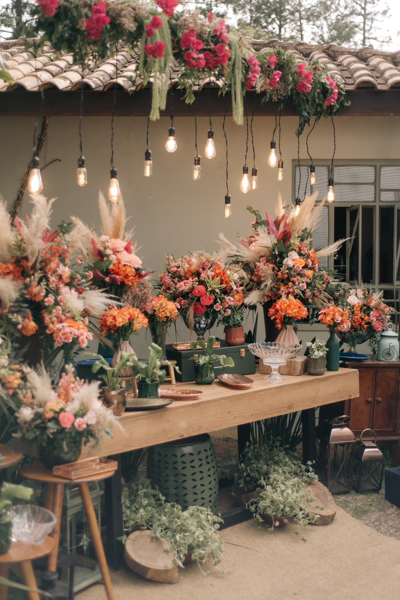 As estampas são bem florais, com elementos de folhagem. Muito uso de capim dos pampas, macramê, rendas, castiçais, camurça, etc.