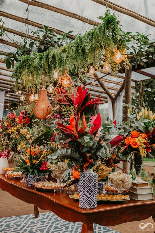 Esse estilo de decoração de casamento combina demais com a praia. Uso de muitas folhagens, como costela de adão, folhas de coqueiros e outras flores tropicais - lírios e antúrios.