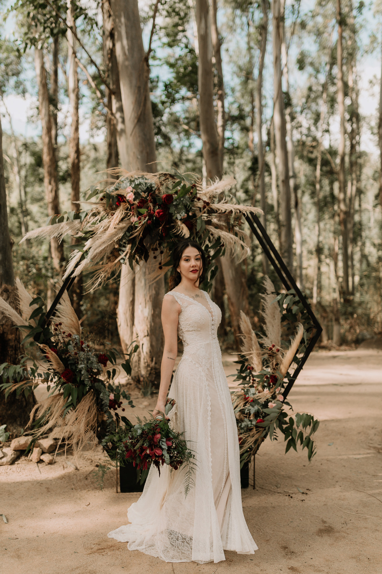 Muitos elementos do boho continuam nessa variação. Como os elementos de natureza e fluídos. Além de ter o vestido de renda, com buquê assimétrico.